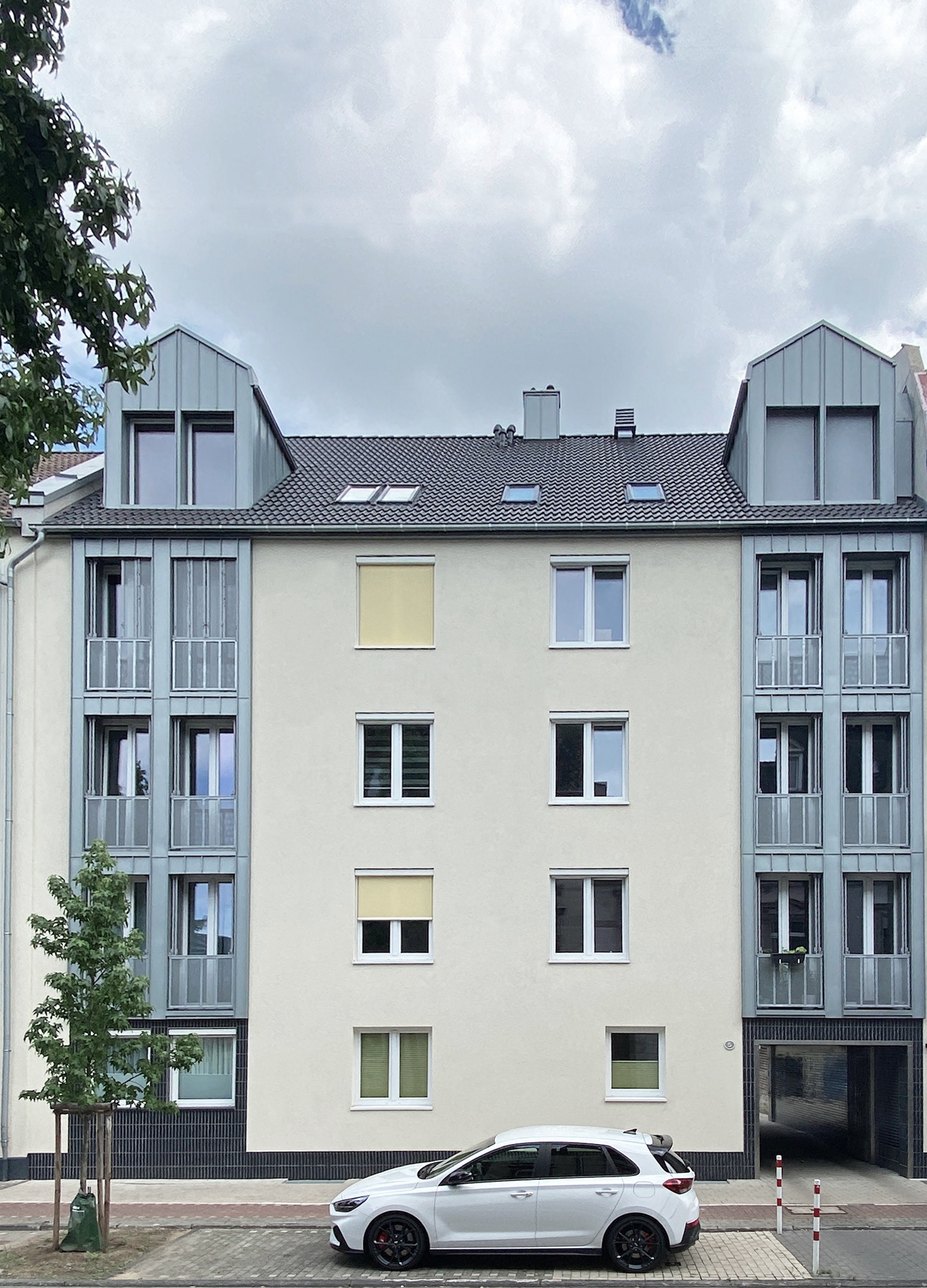 Ein klassizistisches Mehrfamilienhaus in Wuppertal wurde durch Explosion und Brand Aufsehen erregend zerstört. Daraufhin erhielt die Architektengruppe 2018 den Auftrag, die Baulücke zwischen den beschädigten Brandwänden mit einem Ersatzneubau zu füllen. Der viergeschossige Neubau mit insgesamt neun Wohnungen bot die Chance eines energetisch optimierten, zeitgemäßen Mehrfamilienhaus mit massiven Außenwänden und Lüftung mit Wärmerückgewinnung. Das Bauamt forderte, das Volumen des Altbaus nicht zu überschreiten und keine Balkone vorzusehen. Als Ersatz dienen bodentiefe Fenster als französische Balkone mit flächenbündigen Faltschiebeläden als Sonnen- und Sichtschutz. Eine robuste, langlebige Konstruktion und sorgfältige Ausbildung der Details bestimmen die Atmosphäre des Hauses.